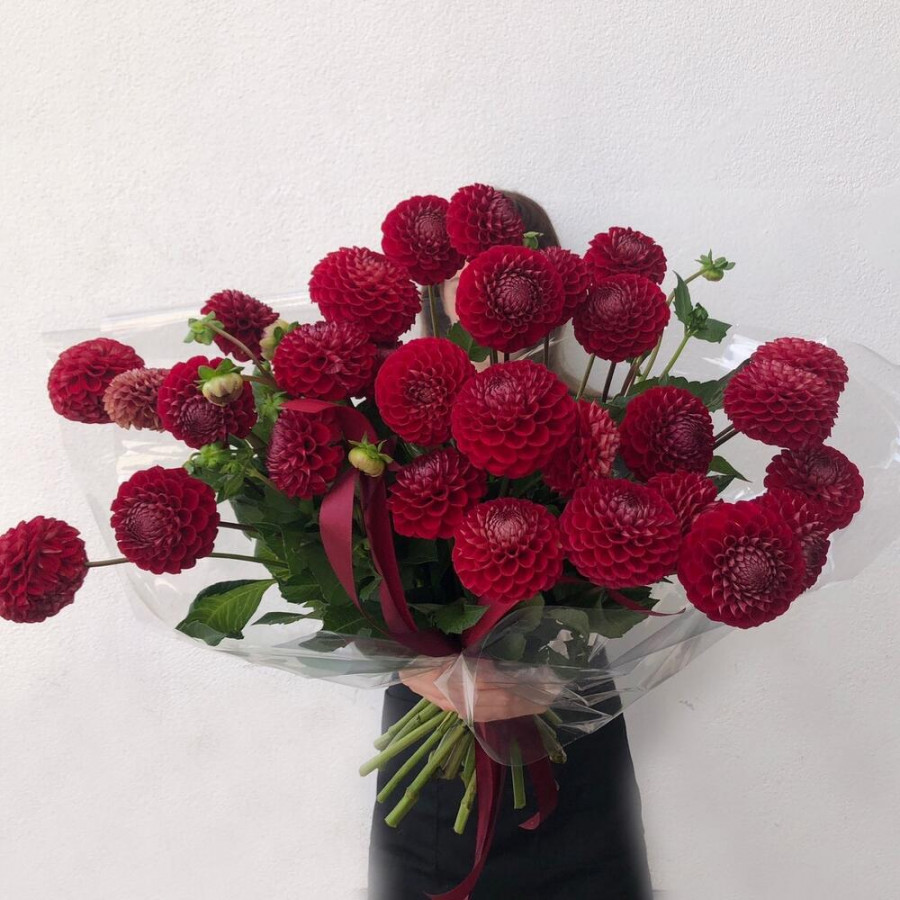 На фото букет из 29 красных георгин. В составе: георгина 29 шт, дизайнерская упаковка 2 шт, атласная лента 1 шт, . Все цветы свежие и ароматные, букет красиво оформлен и отлично подходит для подарка. Доступна доставка цветов или самовывоз.