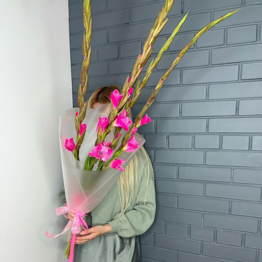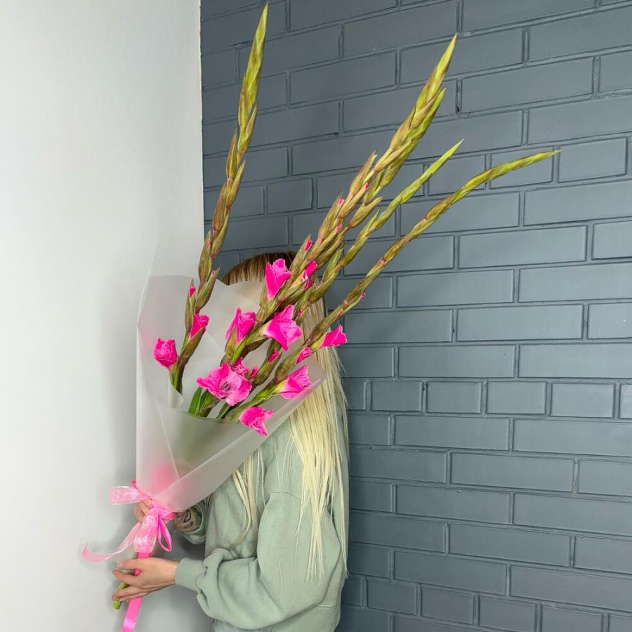 Атласная лента - 3 шт. Гладиолус - 5 шт. Дизайнерская упаковка - 1 шт.