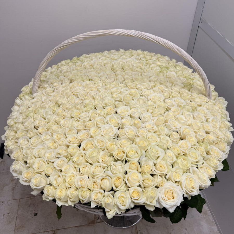 На фото букет из 501 белой розы в корзине «нежность». В составе: роза 501 шт, оазис флористический 7 шт, корзина (xl) 1 шт, . Все цветы свежие и ароматные, букет красиво оформлен и отлично подходит для подарка. Доступна доставка цветов или самовывоз.