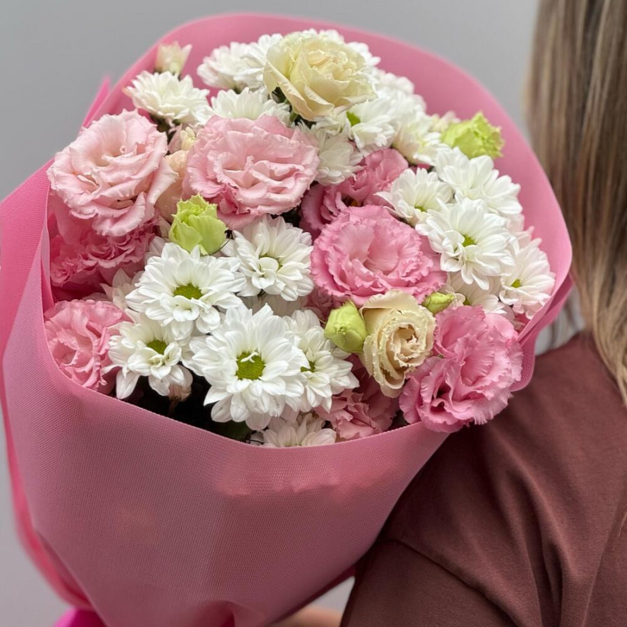 На фото букет «нежность облаков». В составе: хризантема кустовая 3 шт, эустома (лизиантус) 2 шт, дизайнерская упаковка 2 шт, атласная лента 1 шт, . Все цветы свежие и ароматные, букет красиво оформлен и отлично подходит для подарка. Доступна доставка цветов или самовывоз.