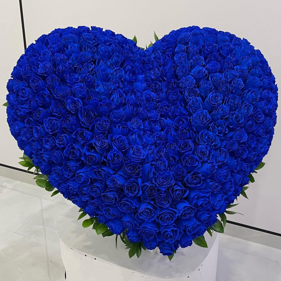 Эффектная композиция в форме сердца из 351 насыщенно-синей розы. Размер ~70×70 см. Сильный вау-эффект для признаний и особых дат.